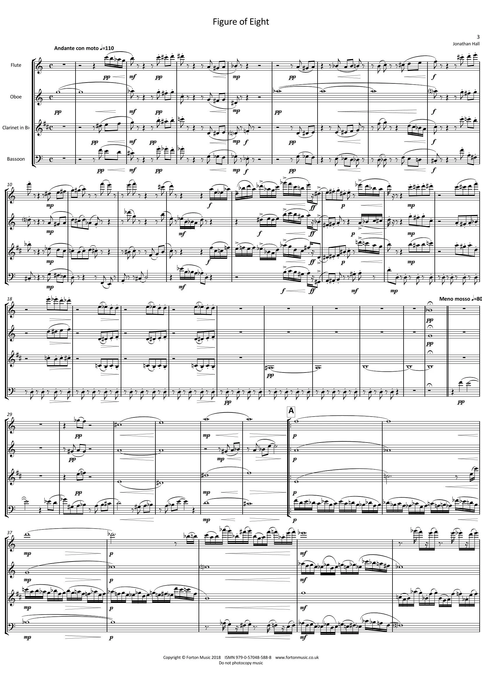 I Figure of Eight: Two main themes dominate this movement; both are quite complex figures (hence the title), but have a natural harmonic and rhythmic progression throughout. Themes and counter subjects are shared throughout the ensemble. Elements of tension and release/discord and resolution are also a feature, although the movement closes perhaps a little unfulfilled.