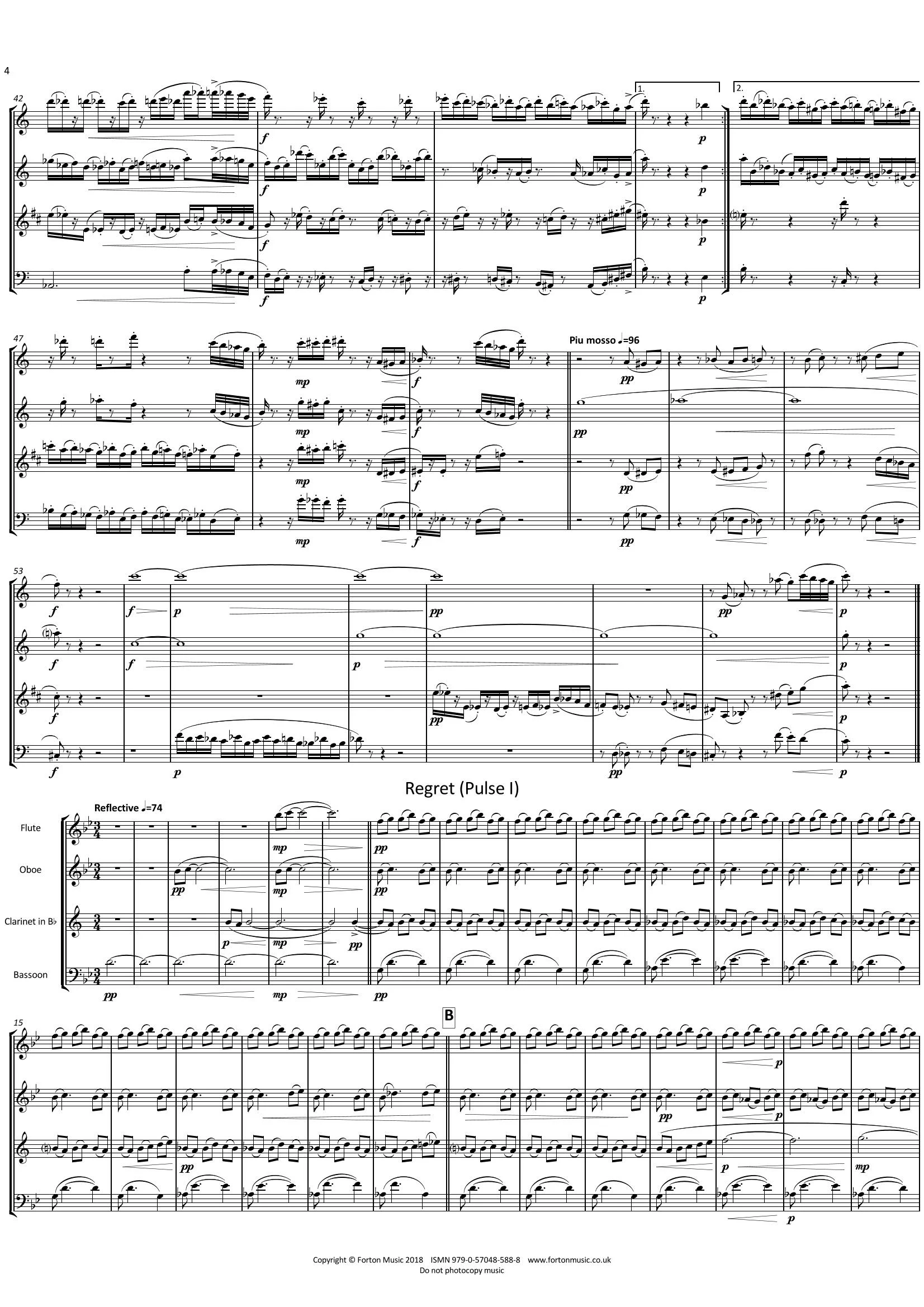 II Regret (Pulse I): This movement has a gentle, but compelling hypnotic pulse all the way though, and was composed employing a minimalist approach. Textures are built around the repetition of smaller shaped figures, whilst lyrical melodic voices rise, then fall from prominence. Control of both dynamics and balance of ensemble is essential in this movement.