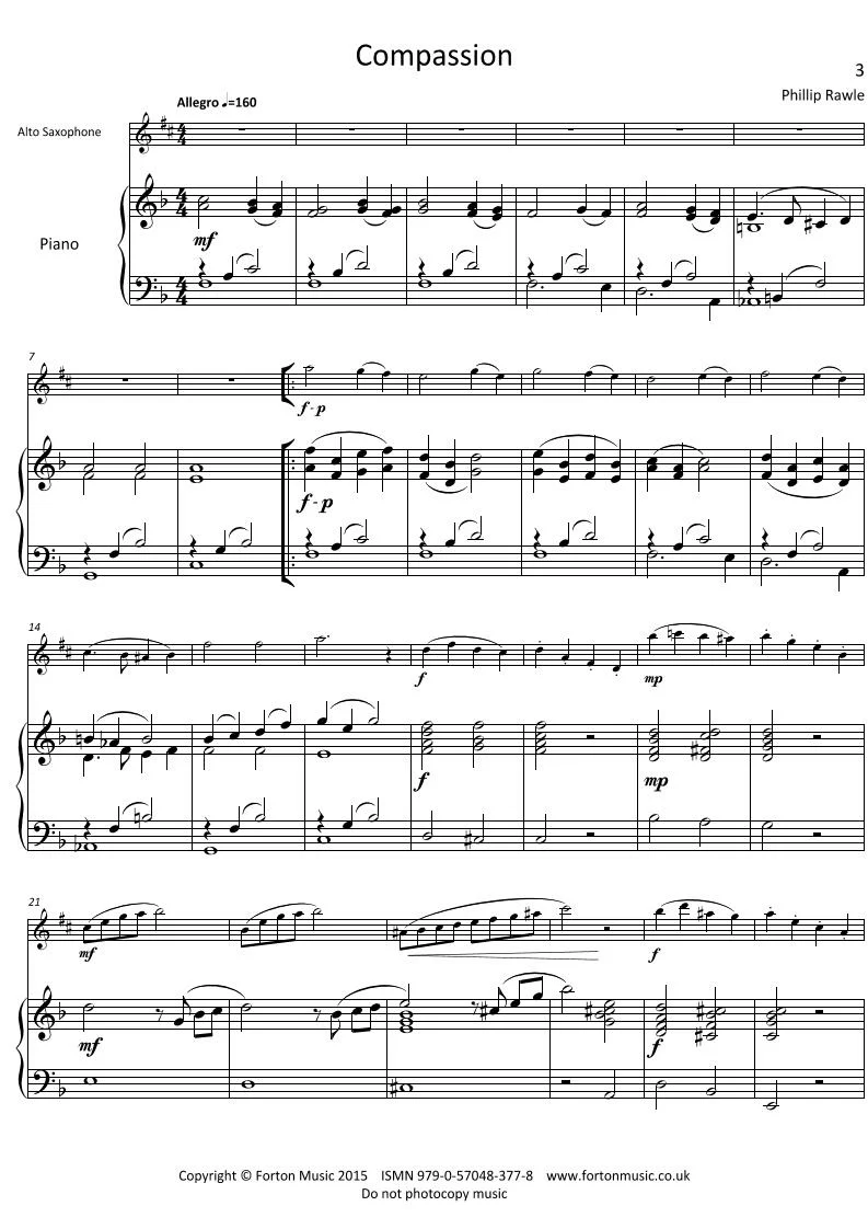 Much more of a duet for flute and piano rather than a solo. This has a yearning, minor aspect with a contrasting few bars of a more comfortable major feel at the end of the middle section.The lively tempo should be driven through the whole piece with only a slight let up in the final two measures. Although written in waltz time, this is no dance being loaded with underlying energy and emotion. The dynamics remain fairly loud with only the expected variation in line with the phrasing.