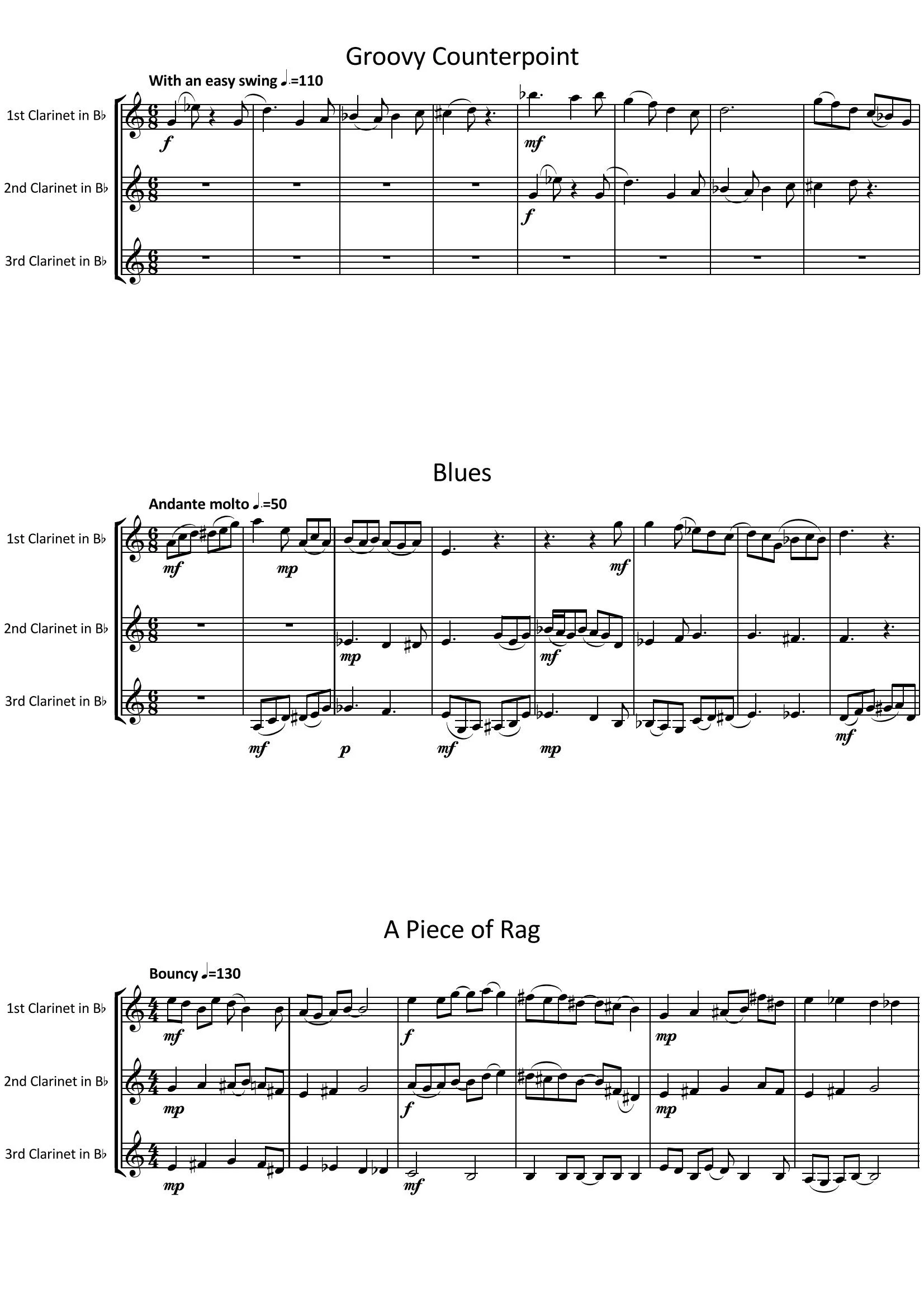 These three trios have been written with developing players in mind. They are intended to be a fun modern twist on counterpoint. The first movement, ‘Groovy Counterpoint’ relies heavily on imitation, as does the second movement, ‘Blues’. The final movement, ‘Piece of Rag’, is in ragtime style, with crisp chordal rhythms, alternating with each part stating it’s melodies and riffs in turn. With their jazzy rhythms, and appealing blue tinges to the harmonies, this is a great collection of pieces.