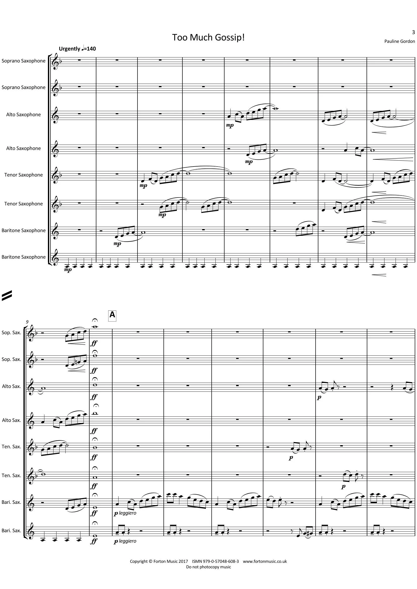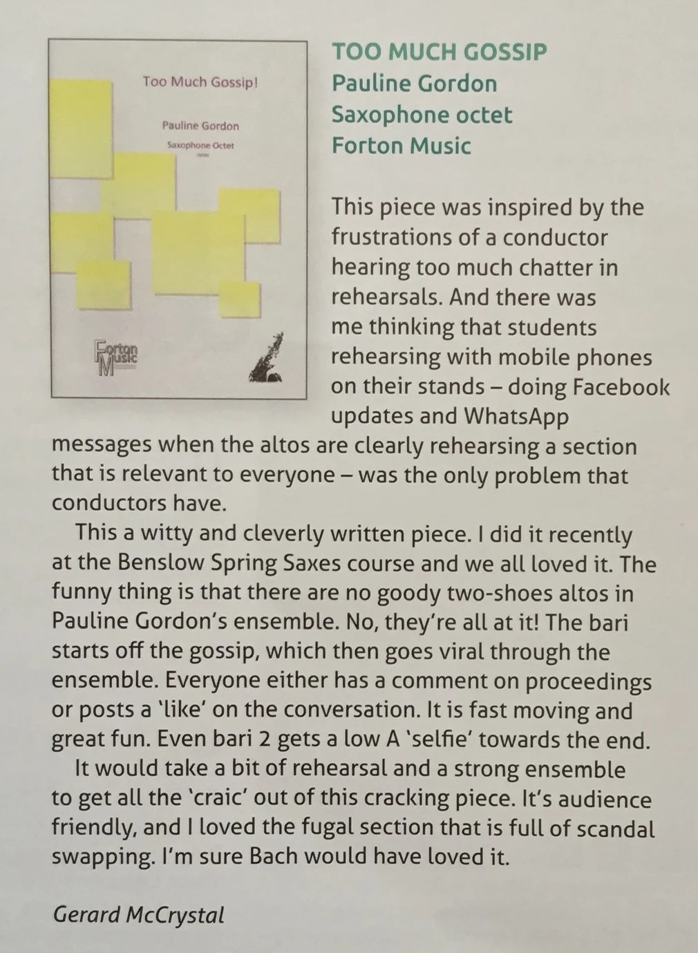 This was originally a twelve part piece written for the Knuston Hall Saxophone course. It was later adapted into an Octet for the newly formed Northwest Saxophone Choir. It was inspired by the frustration of being a conductor and hearing too much chatter in rehearsal time. In this piece the volume of chatter quickly grows but is quelled after an outburst from the conductor. There are then whisperings led by the first baritone sax who has a quiet but lively tale to tell and the rest of the band begin to join in with various fragments. This leads to a noisy fugal section and full scale scandal swapping. The piece ends with the gossipers being shamed into silence.