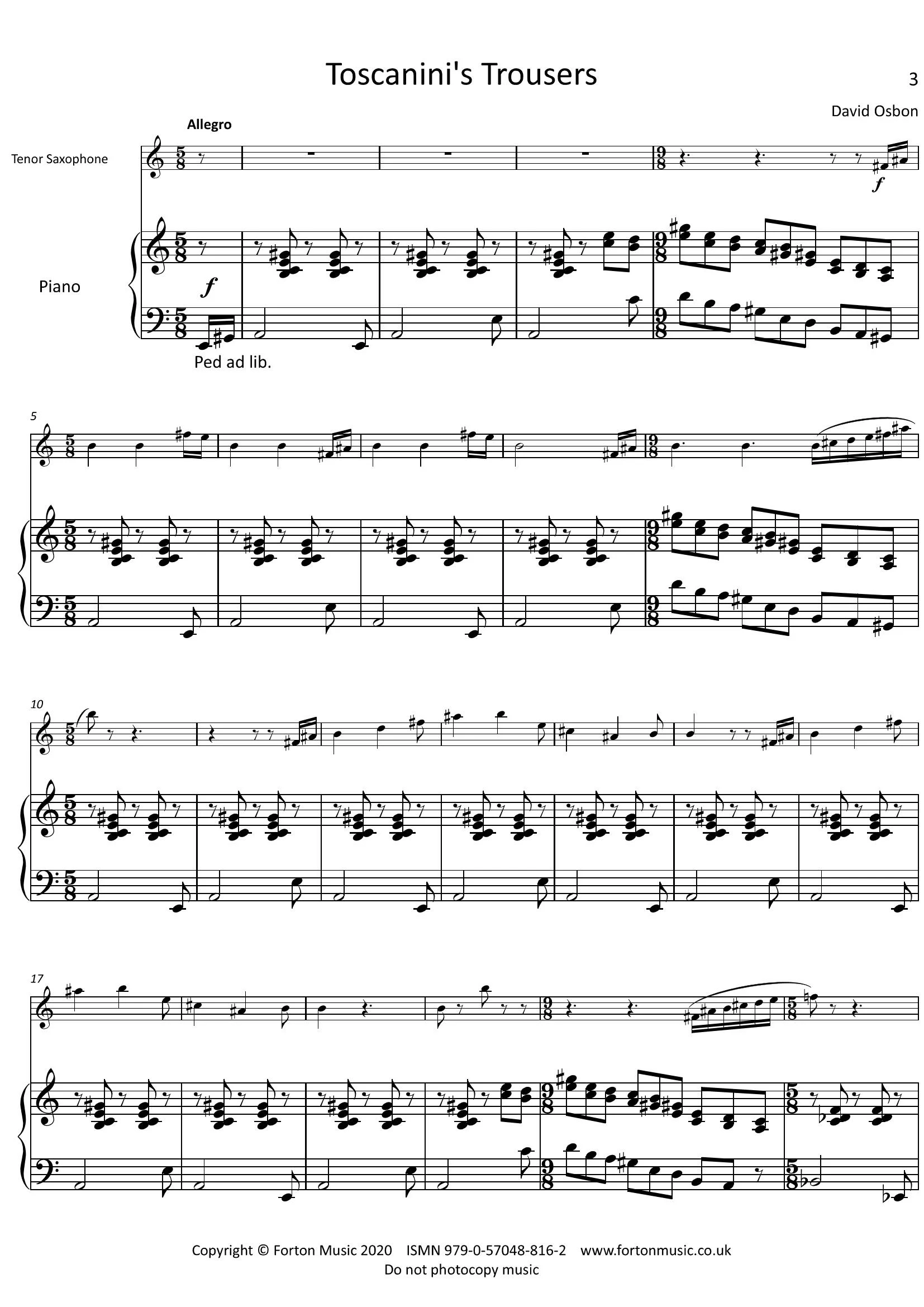 Many years ago I came across a rather unflattering photograph of Arturo Toscanini in his later years wearing a slightly comical looking pair of trousers, it amused me so much that I resolved to write a piece called ‘Toscanini’s Trousers’. Some years later I was composing a set of pieces and the idea of ‘Toscanini’s Trousers’ seemed perfect – the music (like the trousers) gets higher and higher before finally falling down. I have always imagined it as a miniature silent movie comedy, hence the vamp-like piano part.
