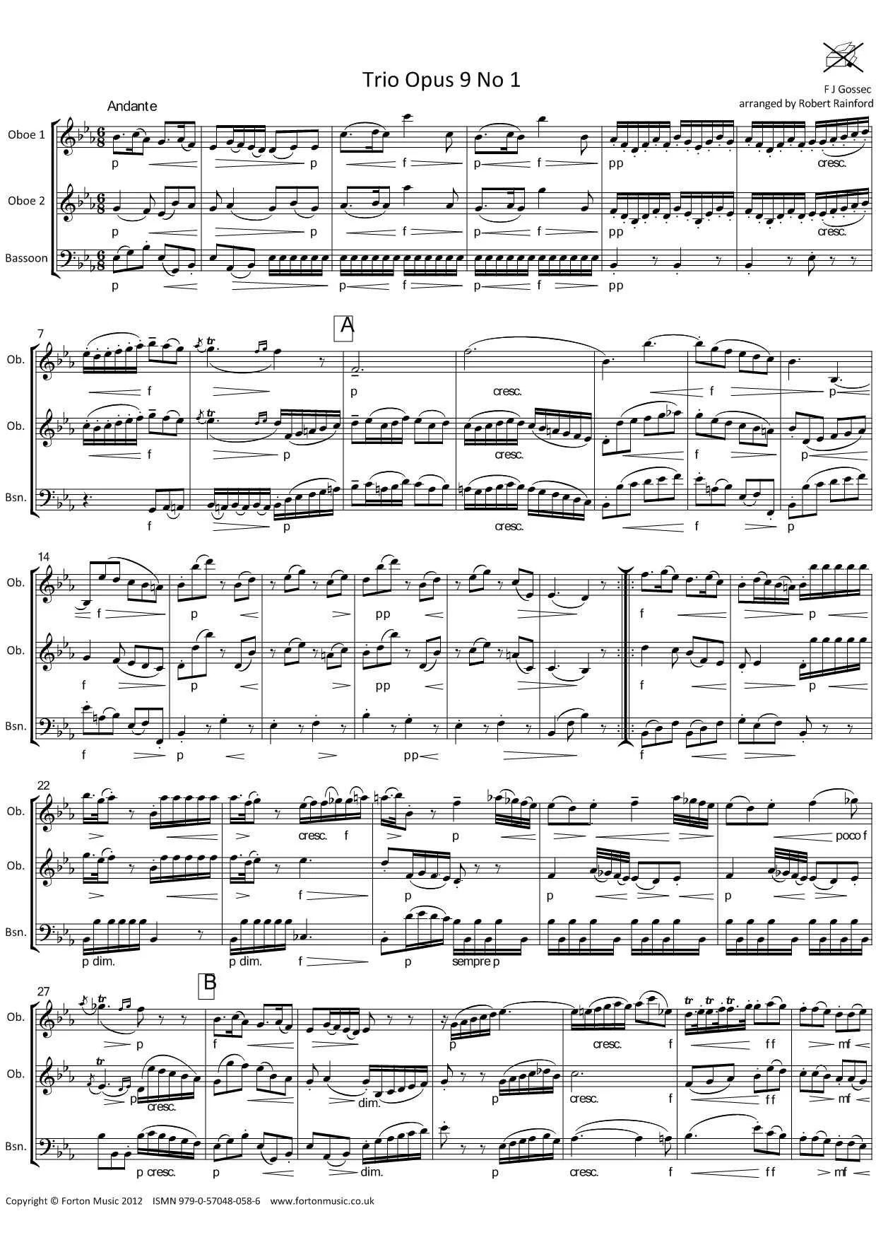 A charming trio for two oboes and a bassoon by the composer better known for his famous Tambourin. In three movements, ending with a minuet and trio. All three parts share the melodic interest with some delightful interplay between them. The second movement is the longest at 99 bars, the others are somewhat shorter. The oboe parts never go higher than top D, but do both include low B flats; the bassoon part reaches top F.