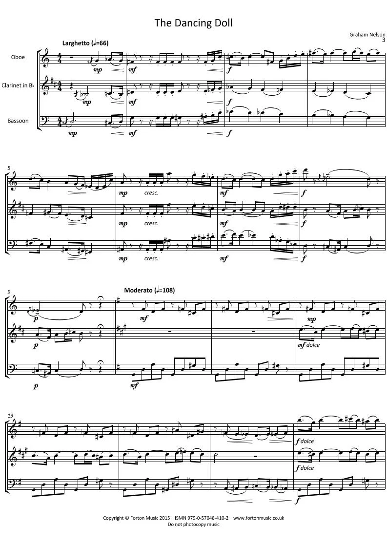 My fascination with the timbral qualities and myriad colours of the woodwind family was the stimulus that led to the creation of these two short pieces for this combination. Composed a number of years ago, both have been revised in the light of experience gained over the passage of time. Aside from the fanfare-like opening, each Miniature is cast in ternary form. The harmonic language could best be described as neo-tonal but with a chromatic twist (notably in the second). Melodic opportunities are shared consistently between the three instruments, often being extended by imitative interplay or antiphonal exchange (especially in the first). A recurring rhythmic motif in both pieces – a dotted quaver idea in the former and a triplet quaver figure in the latter – helps to bind the texture together. The descriptive titles are intended to convey the underlying character of each: ‘The Dancing Doll’ should sound bright, breezy and playful, whereas ‘The Doleful Doll’ is much more introspective and reflective in mood. Finally, the technical and musical demands in the two Miniatures should be within the capabilities of players of intermediate to advanced standard.