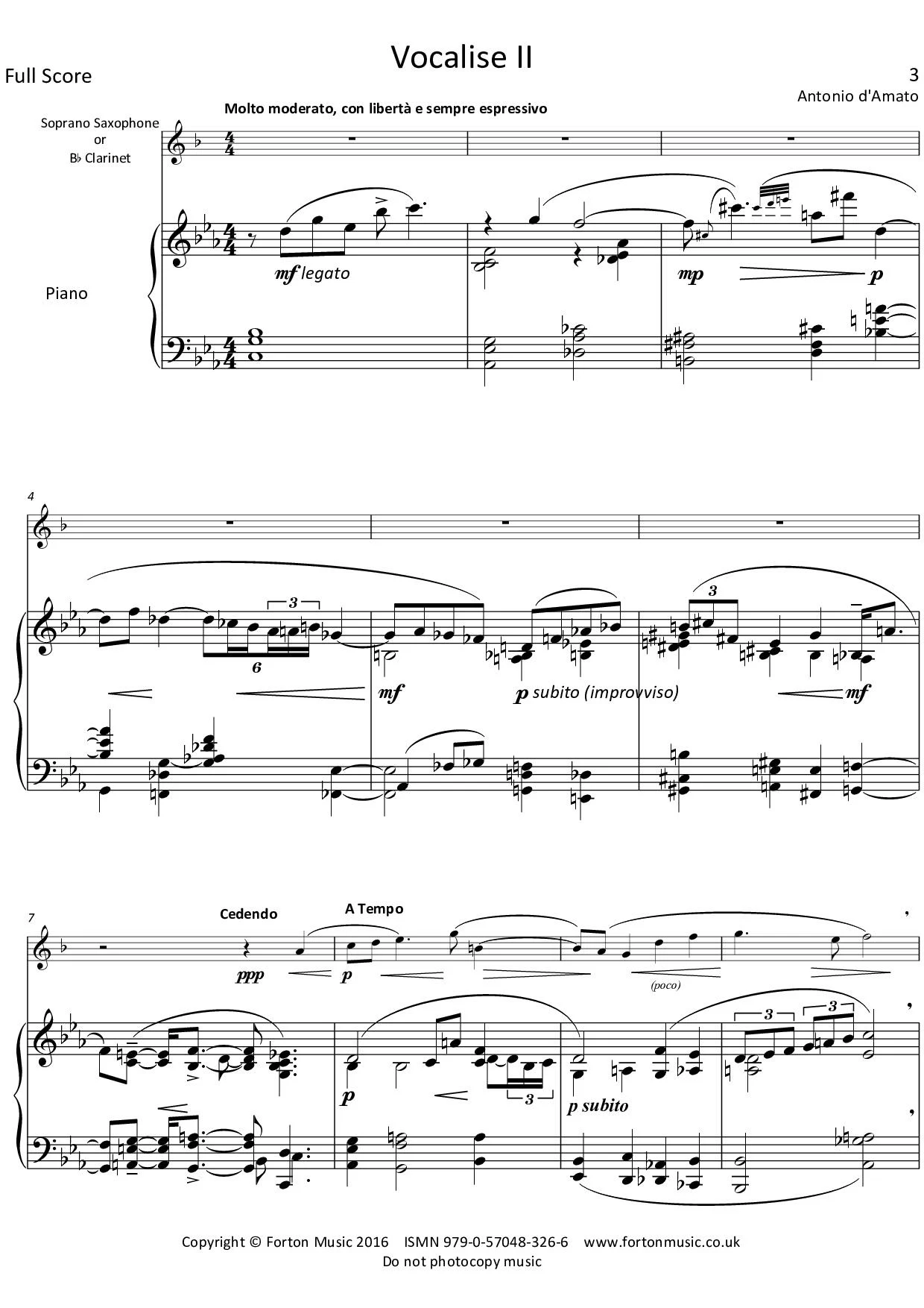 A warm and soft atmosphere pervades the piece. The tempo marking – Molto moderato, con liberta e sempre espressivo (very moderate, freely and expressively throughout) favours the effective partnering of soaring melodies of an improvised character in the solo part with the settled and unsettled rhythms and harmonic textures featured in the piano part. The style combines a classical language with the mood of jazz harmonies. The piano accompanies the leaps and rushes in the solo part with a close, somewhat imitative part. If the Vocalise form truly highlights the singing or even vocal qualities of the solo instrument, then the effort of the composer in this piece emphasizes to a high degree the instrumental vocalism, capable of including the warm fullness of the instrument. This is particularly clear in the extended expressive phrases, with the intentionally fierce harshness and irregular groupings in some passages. In the final section the composer recalls in a personal way, a great classic of the jazz repertoire that he has enjoyed listening to many times in his childhood: Ella Fitzgerald’s scat version of Flying Home. In the final bars, the syncopated solo line together with the percussive piano accompaniment bring to a close a short but well articulated Vocalise through it’s varied moods.