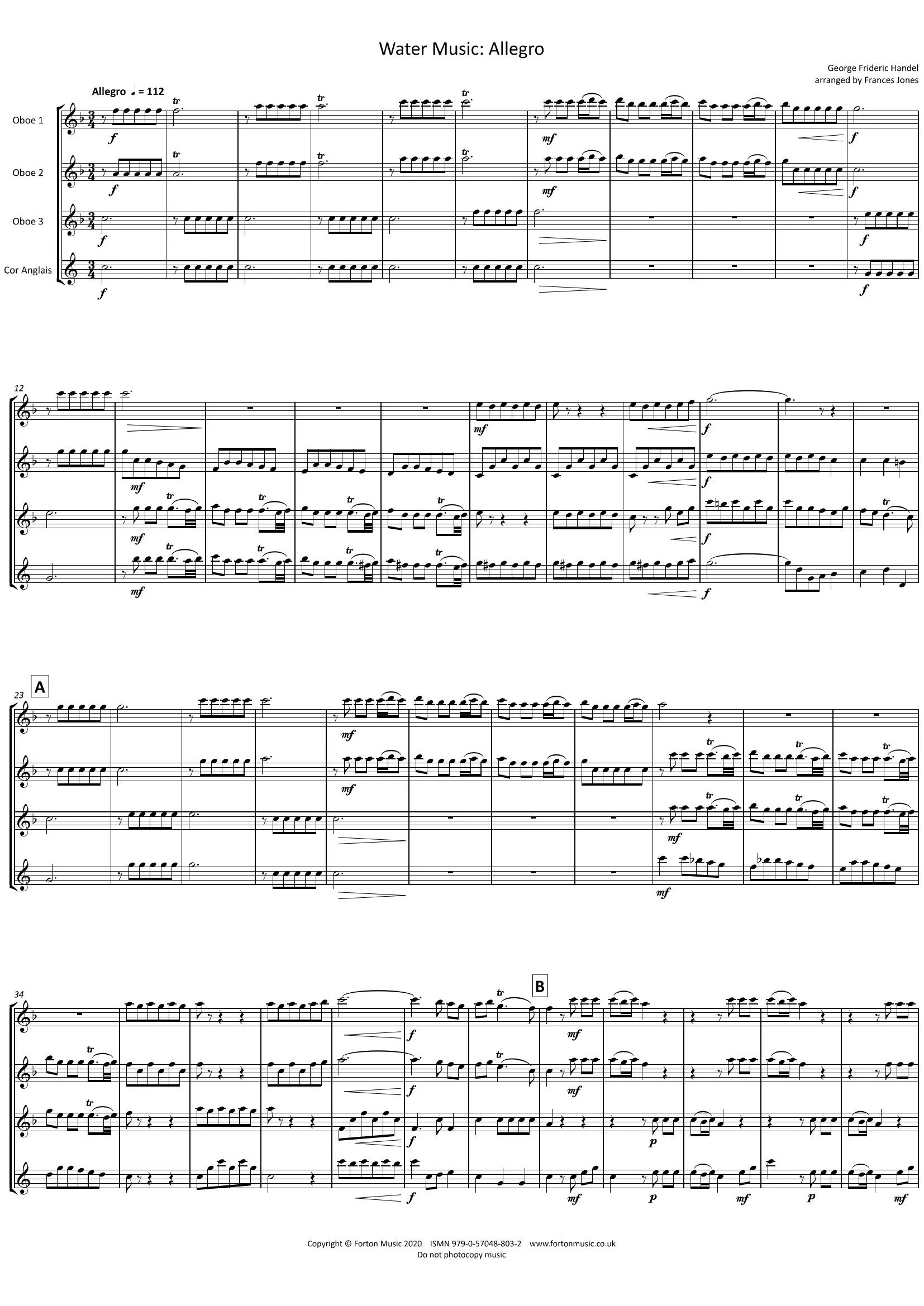 Handel’s famous collection of 21 orchestral pieces that form the ‘Water Music’ was his response to a request from King George I for a concert on the River Thames, that was given on 17th July 1717. King George and his entourage were in the royal barge, moving slowly upstream on the rising tide, while Handel and 50 musicians playing strings, oboes and horns, performed on a second barge alongside. The river was crowded with other boats, and listeners lined the river banks on either side. The king was so delighted with the music that he ordered it to be repeated a further three times, until the flotilla eventually returned to its original starting point in Chelsea. The work begins with a French Overture and there follows a collection of mainly dance movements including hornpipes, minuets and bourées, while other numbers just have a tempo indication, like this Allegro. In this movement, bright fanfares are exchanged between groups of horns and oboes in celebratory style. Arranged by Frances Jones.