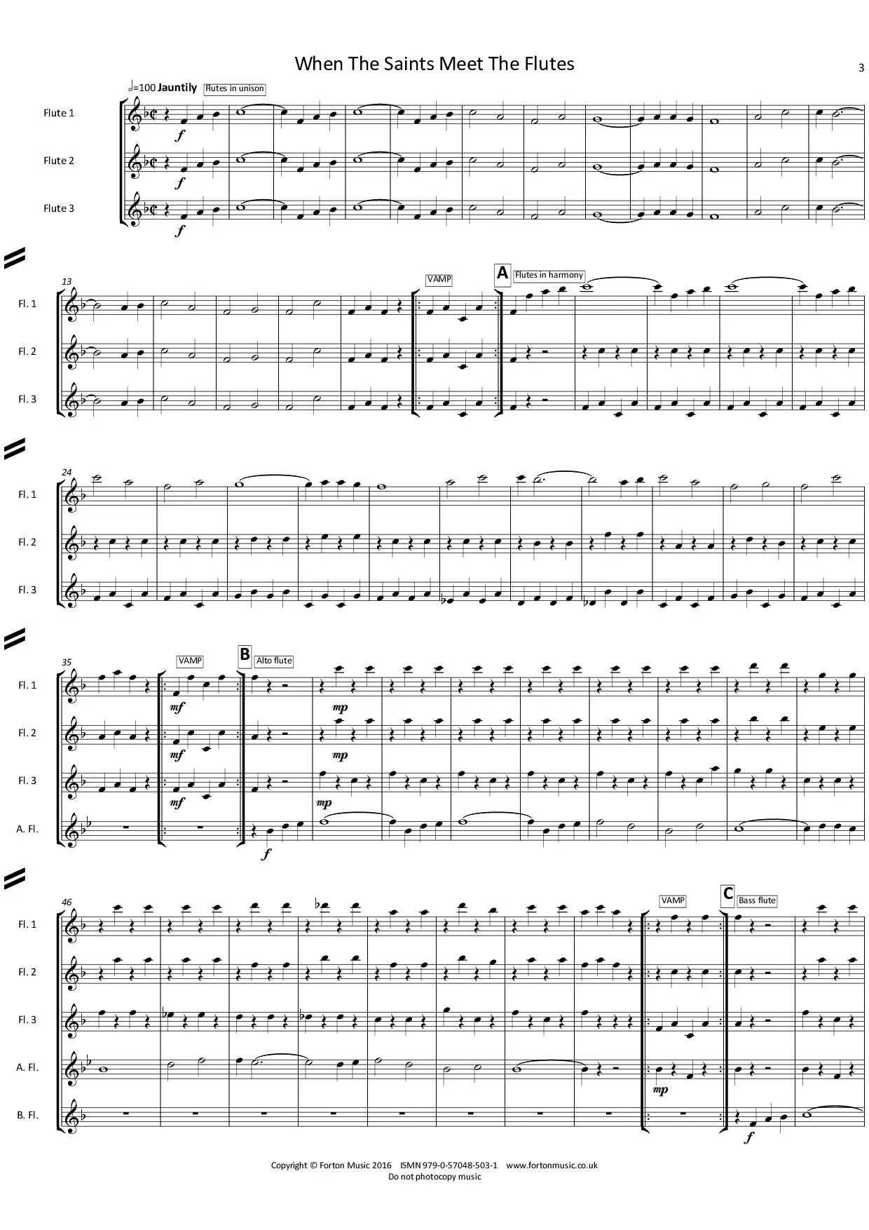 This piece has been created to give the flute choir a chance to introduce the entire flute family to the audience in a lighthearted, fun way using the tune ‘When The Saints Go Marching In’. At each ‘vamp’ section, while the flutes continue to play the ostinato pattern the narrator (this can be the conductor or a dedicated narrator) can talk to the audience about the flute that is about to play the next ‘verse’ of the tune. The style of the narration can be varied depending on the nature of the situation. It may be possible to hold up the various flutes next to each other to give the audience an idea of the comparative sizes of the various instruments. You could also talk about relative pitches of each member of the flute family, their development, some repertoire (both solo and orchestral), and about the development of the flute choir as an ensemble. This piece is performable with the minimum forces of piccolo, 3 flutes, alto flute and bass flute. The sections featuring the other, rarer member of the flute family can be omitted by cutting from the end of any vamp bar to the letter where the next available solo instrument takes the tune. Following the entry of the last solo instrument (the piccolo) there are two sections for the full flute choir. One also features some hidden flute ‘lollipops’ that you may or may not want to draw the audiences attention to, and the final section is a jazzy finale with the option of swinging the quavers. Above all, this arrangement was produced to be usable. Please feel free to adapt it in any way you like to help us introduce audiences to the great sound of the flute choir!